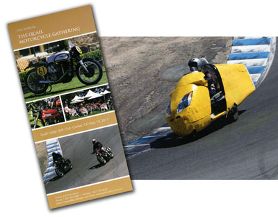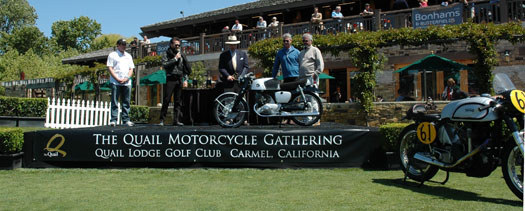 | More on the Quail Challenge, Friday May 13, 2011: Fee is $250, paid to the Quail, includes the ride, breakfast at Edgars, lunch at Mazda Raceway and the fabulous banquet dinner Friday night. It also includes access to the Quail Motorcycle Gathering on Saturday. If you want to show your bike on Saturday, the $95 fee is waived. There is no additional charge for the Vetter Challenge. The Vetter Challengers will ride with the Modern Motorcycle class riders (as opposed to with the Vintage riders.) At least, we should not be slowed down as much as last year. | ||||||||||||||||||||||||||||||||||||