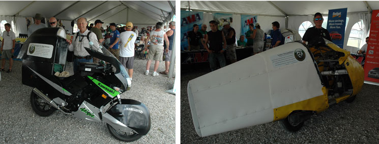 ![]() | Fred Hayes came all the way from California with this wonderfully streamlined Diesel powered motorcycle. He designed and made this motorcycle himself. He rode it himself! This man is amazing. Fred had just won the Quail Challenge with much less sophisticated streamlining. This machine represents the best of the best. How could he be beat? All we can figure is that Charly Perethian's years of experience must be responsible. I am grateful that Charly is sharing his knowledge (above). | |||||||||||||||||||||||||||||||||||||||||||||||||||||||||||||||||||