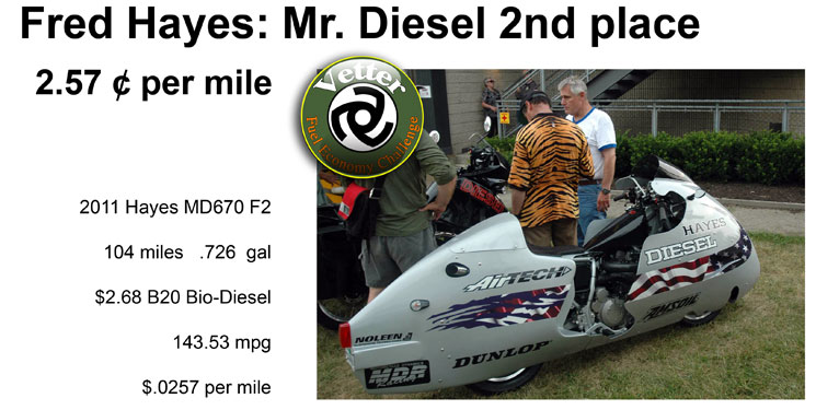 | My streamliner used the production configuration engine and frame from the MD670 F3 Diesel Motorcycle. The only difference was the fairing and final gearing (15/40 vs. 15/43). The fairing was from AirTech and Noleen J6 modified and shortened the production suspension to better fit the fairing. It carried the four bags of groceries inside the fairing, 2 bags in the front and 2 bags in the rear section. The fuel was B20 Biodiesel using Biotane refined waste vegetable oil. All Hayes Diesels use Diesel rated AMSOIL. One of the, not so secrets of fuel economy, is to use lighter weight oils in the engine and transmission. I use AMSOIL Series 3000 5w-30 Heavy Duty Diesel motor oil. The Series 3000 5w-30 is especially suited to use in the Hayes Diesel as it is a great diesel motor oil, but it is also compatible with a motorcycle-style wet clutch. | ||||||||||||||||||||||||||||||||||||||||||||||||||||||||||||||||||||
