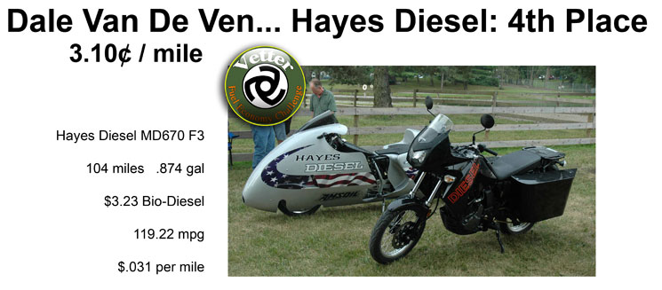 | Dale Van De Ven rode a production configuration Hayes Diesel MD670 F3 to 119.22 mpg. This was Dale's first ride on the new Hayes Diesel. He seemed to adapt quite well. The MD670 ran the same B20 Biodiesel as Fred's streamliner. Fred was heard to say: "Dale's 119 mpg was more impressive than my 143 mpg." The "Carol Vetter Approved", four bags of groceries, saddlebags were custom built by RT Fabrication in Hesperia, CA. | ||||||||||||||||||||||||||||||||||||||||||||||||||||||||||||||||||||
