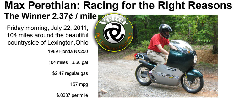 | Charly tells how they did it: 1. Bike selection. The NX250 was actually the 2nd bike we tried; I bought the used 1989 Honda locally off craigslist [for $1600] on March 12, 2011. It's light: 280 lbs, wide ratio 6 speed, high 11:1 compression, liquid cooled four stroke single. the absolutely stock bike got 86 mpg on my test loop. The engine was never touched except for 3 degrees advanced ignition timing and a thin foam air cleaner element. 2. Bike mods-- GMD ATL lowered the forks and checked geometry and alignment. A low Works shock and 16" rimed front rim was laced on. Clip ons, rearsets, TALL gearing [15/33] less restrictive air filter element, ignition timing advanced 3 degrees. The naked bike was now up to a consistent 110-115 mpg. 3. Streamlining. Our fairing was a much modified [raised and widened, headlight and turnsignals 1968 Harley XR750TT racing fairing. I followed Max around and it turned heads at the track; I knew the base race fairing was good from my 2008 vintage racing season: my CB350 would blow by all the other modified CB350s on the long straights. When the fairing was tested mileage was up to 145 mpg. Our last test run before the contest was 156 mpg. 4. Carry: We thought from that we would need a 2 bag tail but the combination of wide fairing and really narrow engine allowed room for a bag on each side. Our last 156 mpg test run was actually with grocery bags filled with styrafoam peanuts to make sure they did not burst into flame. Max is [along with being an accomplished roadracer and hare scrambles racer] a bicycle racer: 6'1" and a fat free160 lbs. Plus, he could ride a pork chop past a wolf. He consistently recorded slightly better mileage than me, so I think weight is a factor. Do you think Charly will offer his high mileage streamlining components to other Challengers? I hope so. Stay tuned on his Parabellum web page | ||||||||||||||||||||||||||||||||||||||||||||||||||||||||||||||||||||