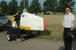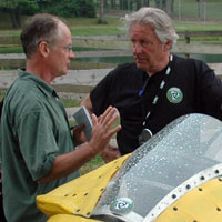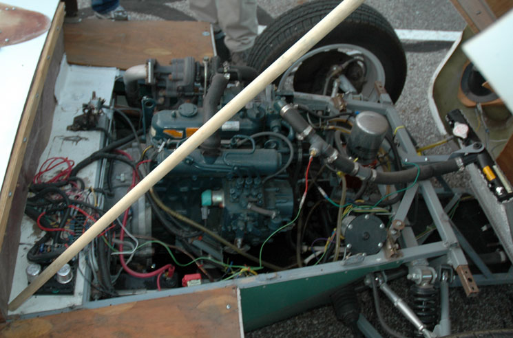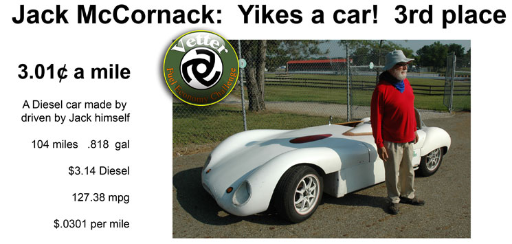 | Jack drove his Diesel car from the West Coast to the Challenge, arriving late the night before. For those that are not familiar with Jack, take a look at his Blog. Jack says: "I was quite surprised when the pump clicked off with less than three dollars on the clock, and it took me some careful squeezing to get it all the way up to $3.14, which was significantly better than I'd expected--better by about 50 cents, better by about a pint. I'd hoped to break 100mpg by a decent margin, but 127mpg was incredible. Literally. Like, not credible. "When aircraft or vehicle designers say, 'It performed even better than we expected,' I'm not impressed. This result at the Vetter Challenge was about 20% better than expected, and my ego won't allow me to jump up and cheer when I'm that far wrong, even when the error is in my favor. "I suspect the problem is fuel expansion with temperature. The day warmed up a lot between morning and noon, and compensating for one pint of fuel expansion gives a more credible 110mpg. "Of course, the main reason I broke 100mpg is that MAX (that's my car, Mother's Automotive eXperiment) is designed for efficiency. " | ||||||||||||||||||||||||||||||||||||||||||||||||||||||||||||||||||||