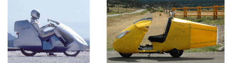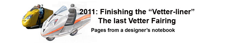 | Conceived in an era of 55 mph speed limits. Motorcycles were getting bigger and bigger... burning more and more fuel. It looked to me like we did not need all that power. I wanted to know what was really needed to go 55 mph, sitting up and comfortable. How much power was really necessary? Nobody could tell me. I built this streamliner and found out: A streamlined Kawasaki 250 single, putting out around 20 hp gave me a real 108 mpg in the 55 mph world of my fuel economy contests. I used this bike to inspire others in a series of contests between 1980 and 1985. It took the other challengers no time whatsoever to beat me in my own contest.Unfortunately, the bikes that got fantastically high mileage were so uncomfortable to ride, you wouldn't use them for anything but an economy contest. I had no plans for producing this design. I just wanted to know what was possible. | Conceived in an era of 70-75 mph speed limits. Motorcycles have continued to guzzle fuel. Even more serious, 3 out of 4 gallons of the fuel we use for transportation is imported. I was thinking that reducing our use of fuel by 75% would be good for America because we could stop importing the stuff. I was thinking that I could be part of the solution. I was thinking that people that get 100 mpg ought to be rewarded. with special freedoms. When I began in 2007, I wanted to know: Was it possible to get 100 mpg at 70 mph, into a 30 mph headwind, with a useful load as represented by 4 bags of groceries, sitting up and comfortable and be the first choice among vehicles in the garage? I knew it had to be streamlined. I guessed 17 horsepower would do it. This time, I hoped to end up with a kit for others to experiment with, too. Thus I spent a lot of time making sure it would be kitable. The components would have to be designed to be easlly shipped. What could not be shipped needed to be available locally. It would have to be make-able in a home shop. The headlights were a major consideration. They must be streamlined and affordable. The whole story of its development begins here. So far nobody has proven that the above is possible. A couple of pioneers have gotten close to 90 mpg but the headwinds were less than 30 mph. "Streamlining is easy to say but hard to do" My goal is to end up with a kit that will make streamlining easy for anybody that wants to try. Many people think electricity is the future. Or Diesel. Or hydrogen. Or gassified wood chips. Whatever power you choose, the streamlining provided by the Vetter-liner Kit will allow less of that fuel to go faster - and carry more in comfort. | ||||||||||||||||||||||||||||