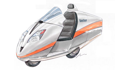 | Hi Craig - Congratulations on getting the design down on paper -- definitely looks more like a streamlined plane from the 30s than a banana with measles. Over on the feet forward group on Yahoo (frequented by Royce Creasey and others), most of the concern is about the air around the neck of the rider. Of course it would be nice, in some respects, to have a fully enclosed cabin, but it has limitations, too. Vetter comments: No wind on my neck. That all stopped when I added the headrest with the tail light and license plate up there. The air cannot reverse. There is no air on my neck at all. One thought I had is whether you had considered wire-frame designs such as this project car that got some press recently. See this YouTube video: http://www.youtube.com/watch?v=JgZ3bO1LS78 It was built in my town, Kansas City, by a high school for troubled youth. The teachers in the class are no design slouches. The lead is Steve Rees, an architect and former car racer in the area. The project was innovative enough to impress Bridgestone, who opened up their test track for the students and provided major funding. I saw this car and it's pretty amazing. On top of a discarded Indy-car frame, they designed and built a wire chassis and then used heat-shrink plastic over it. This is the same type of plastic used in sealing storm windows. The plastic was sturdy enough to survive testing, and any holes could be easily patched, using the same material. Can this be used in your final production design? Probably not. But perhaps you can use it for testing purposes, and maybe someone else can come up with some great idea, taking the wireframe in a different direction. Vetter's comments: I would love to use film. But it really does not look any better than the plastic sheeting, does it? Thanks for sending the link to your page about the Keogh design. And hope you have a Merry Christmas, too. Harry | |||||||||||||||||||||||||||||