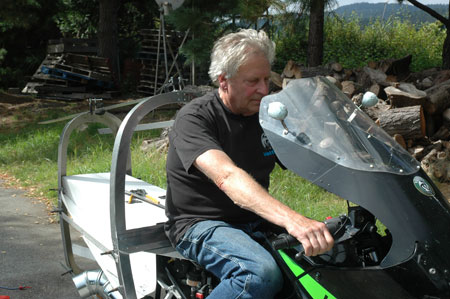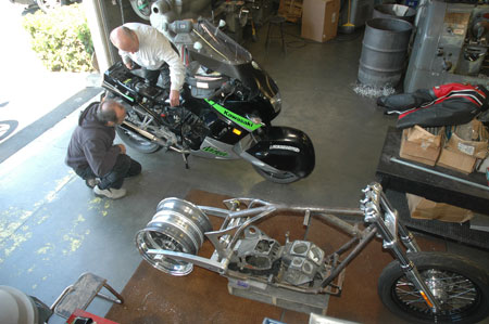 | Next stop: A visit to Kosman Specialties in Norhern California. Martin Windmill and Alan Smith consider how we might get the rider lower, thus reducing the frontal area. If anybody can figure out how to get the rider lower on a Ninja - or any kind of motorcycle - it is the folks at Kosman. | ||||||||||||||||||||||