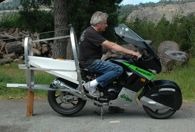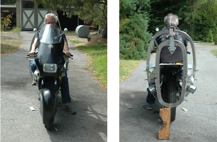 ![]() | There is a lot to look at here. Sure is a short motorcycle! Right angle extensions (household chimney parts) have been added to the exhausts to help get the hot gasses outside the surface of the streamlining. Notice the angle of the rear storage floor. It slopes forward so things will slide forward to keep the weight forward. Conestoga wagons were curved to help things slide to the center. | |||||||||||||||||||||