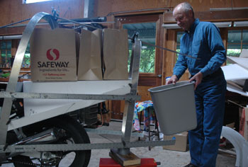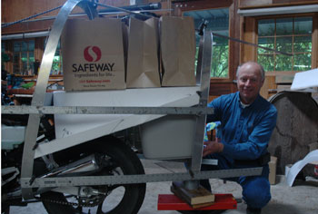 | We were surprised to discover that five grocery bags would fit The fifth bag at the rear is a little squished but when we tip the tail up into its proper location, it will have more room. To win a Vetter Fuel Challenge, you must be able to carry at least four grocery bags, open top up, unsquished (to the satisfaction of my wife and Challenge Judge, Carol Vetter). Some complain that the requirement to carry a useful load - like four bags of groceries - means we will all look the same. It is probably true. I have been saying for years that when we are properly streamlined, we will all look the same. Get over it. | ||||||||||||||||||||||