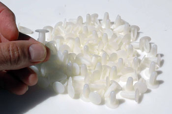 | Our first Kit of Banana Tacks These can be painted. The Streamlined body on Alan's Ninja took 86 Banana Tacks. The Tail took 36 more. | Punch a hole in Milk Carton Paper We pre-drilled the aluminum with 1/4" holes and shined a light from the inside to see where to punch | |||||||||||||||||||||||||||||||||||||||||||||||||||||||||||