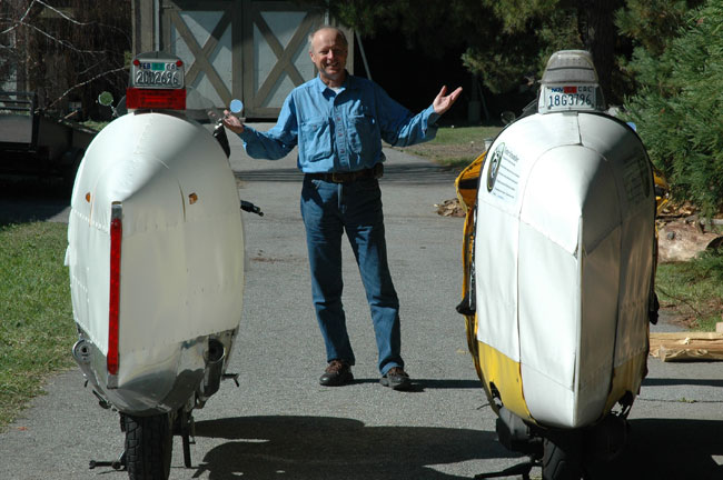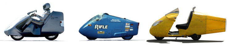 | Designed for "Luxury Touring" at 55 mph 250 cc Kaw single Began the Vetter Fuel Economy Contests 108 mpg Max comfort Some storage Heavy No intention to duplicate Labor intensive to make Hard to get on and off Never was "first choice" to ride Ended up in AMA Hall of Fame Museum | Designed for 55 mph Production version of Charly Perethian's Rifle design of 1982 Designed to win contests Designed to be duplicated. About 25 made Won all the contests with 125-180 cc engines. Maxed out at 477 mpg! Not comfortable Originally made of ABS. Currently in fi-glass Tooling still here; streamlined body is still available Expensive to ship Hard to get in and out off Never was "first choice" to ride Ended up in Smithsonian | |||||||||||||||||||||||||||||||||||||||||||||||||||||||||||