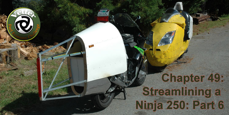 | "I noticed that the white foam pressed into place at the rear of the body gets pushed forward when I am riding on the freeway. I guess the Kamm Effect has some drawbacks." Craig comments: Back in the 30s, Wunibald Kamm said that you could cut off the long tail without adding too much drag. Why would I want to add any drag? Look at the above picture. It is essentually a "Kamm" cut. Air curling around from the sides - caused by incomplete streamlining - has turned 180 degrees to push the foam forward out of place. Obviously, this is power-robbing drag. Alan continued: "Riding in heavy rush hour traffic at 60-70 MPH I get a some buffeting. This could be from the enclosed front wheel. I have not ridden the Ninja 250 with the new rear body enough to fill the gas tank yet. With my observations the body might not show improvement until the tail is installed." Craig continues: Alan's observations are very important. He knows his bike! | ||||||||||||||||||||||||||||||||||||||||||||||||||||||||||||