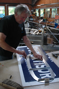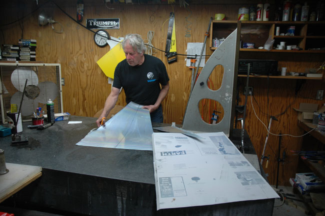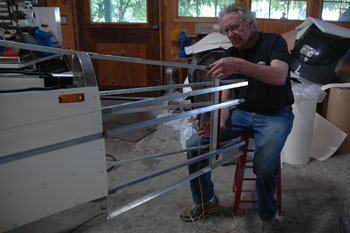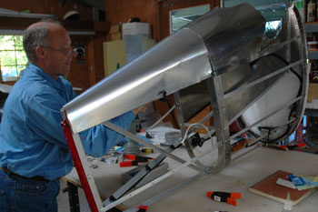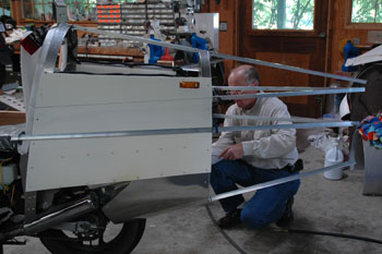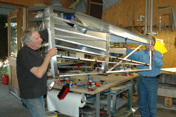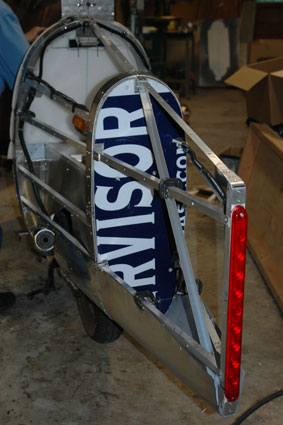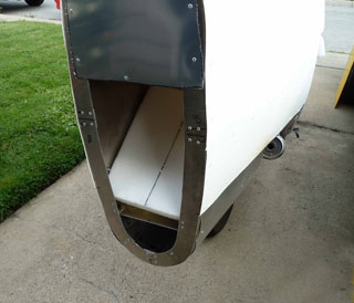 | Al;an has been riding with the Streamlined Body Kit only. It is time to finish it with the Tail Kit. Up until now, I just assumed that we would be making the Tail as a separate piece, held on with bungee cords, as on my Streamlined Helix. Alan and I discussed the fact that I actually never remove the tail. It was going to take a lot of time to solve a problem that is not a problem. We decided to make the Body and Tail one piece and save some time. In a few minutes, Alan had pushed out the Banana Tacks and removed the skin. To continue the aluminum bottom, I decided to use the much lighter printing plates from the local newspaper: | ||||||||||||||||||||||||||||||||||||||||||||||||||||||||||||