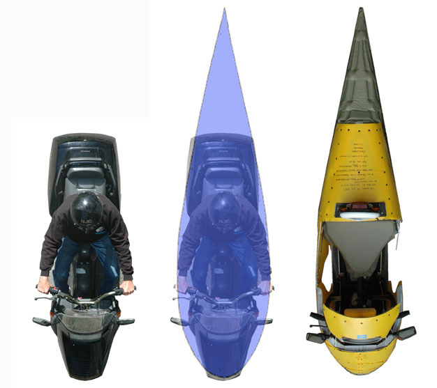 | The answer is very simple. Left: Me on my Helix, 3 years ago. Center: A streamlined shape just big enough to go around me and my Honda Helix. Right: Real streamlining. My understanding is that any shape other than this would be less streamlined. If you make one, Mike, you can cut it off any place you want and see what it does. This is a grand adventure, you know. I am sure we are learning things nobody knows. Come join the club. | ||||||||||||||||||||||||||||||||||||||||||||||||||||||||||||