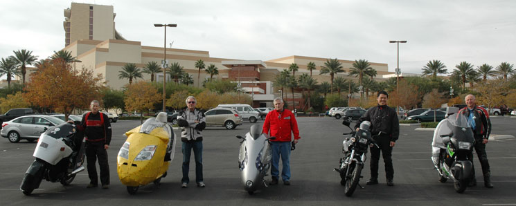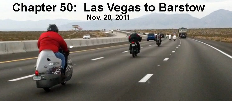 | Oh yes... what about the suitability of Las Vegas to Barstow for a Vetter Challenge? On November 20, 2011, it was easy. No rain. No snow. No awful side winds coming from this way and then that. Not much traffic. It was easy, beautiful and fun. Locals say that what we experienced Sunday was pretty much the norm for this time of year. I am thinking it can work. The AMA has announced that it will have its Hall of Fame inductions in Las Vegas again in 2012. I am thinking that if the weather looks safe, we can and should hold the Final Vetter Challenge for the year between Las Vegas and Barstow. Your thoughts? | ||||||||||||||||||||||||||||||||||||||||||||||||||||||||