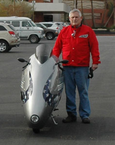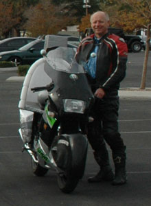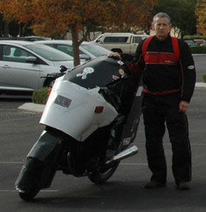| During the fuel economy competition, I was surprised that speeds on my speedometer were closer to 75 MPH or higher. A couple of times I topped 80 MPH to keep in the group. I was worried that the higher speeds would drop my fuel consumption. Crossing over the two mountain passes; I was able to pull it in top gear. If I needed extra power I could always down shift a couple of gears. At 70 MPH the engine is only turning about 6,500 RPM, red line is 13,000 RPM. So I have a lot of reserve power to play with. As far as my streamliner protecting me from the elements, the current configuration has my hands and feet exposed to the wind. During nice weather this is not a problem since the rest of me is well protected. The ride home from Las Vegas was in heavy rain and strong wind for over an hour before crossing the mountain pass. At the mountain pass the air temperature was 37 degrees (F), my gloves and boots were soaked so my hands and feet froze. The rest of me was comfortable. That is one reason that I need to up-grade the front of my streamliner this winter. Also none of my gear got wet in the new tail during the heavy rain. For next year’s competition I want to try even taller gearing and improve the aerodynamics of the front (get the hands and feet out of the wind). If I can afford it I would like to have someone look at my engine to see if any improvements can be made. My goal is to average over 100 MPG next summer in day-to-day riding, which means cruising 70 MPH on the freeway not 55. I think I will have a busy winter." | ||||||||||||||||||||||||||||||||||||||||||||||||||||||||