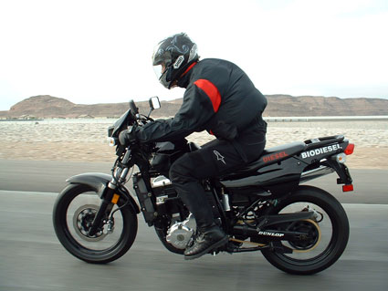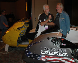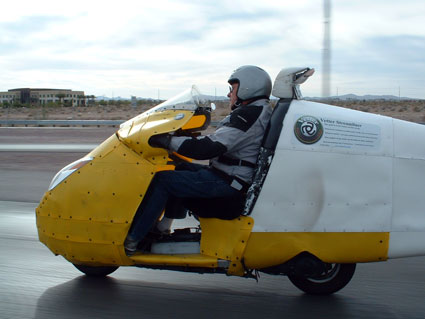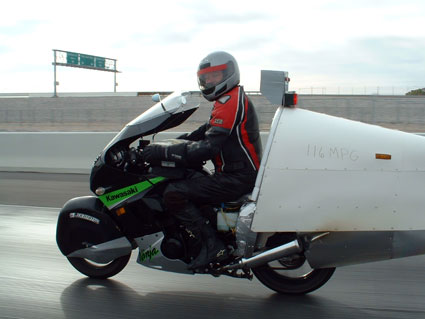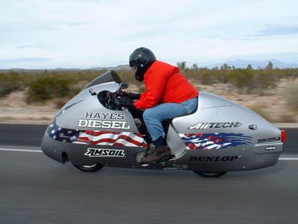 | I also noticed that when I tucked completly in, with the same throttle, the speed picked up instantly 3~4 MPH. But I could only hold that position for a few second because I couldn't see the road well in that position. Fred Hayes, the bike's owner and builder adds: "The Street Fighter had a new modification to the air box and intake manifold, and had taller gearing over what we had at Quail. The engine is tuned for max hp, not fuel mileage. The same as was Dale's during Mid Ohio. The fuel mileage actually seems better with performance engines. Obviously, Joshua was totally exposed." | ||||||||||||||||||||||||||||||||||||||||||||||||||||||||