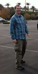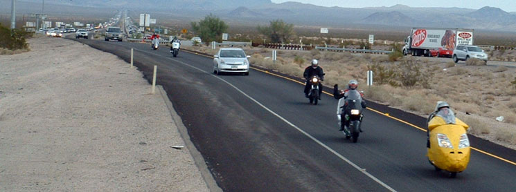 | Meet Garth LaComb Garth has been following our progress on the internet and is already involved in fuel economy in the Seattle area. He stopped by to help out. We welcome like-minded folks like Garth and will do what we can to support him. This meeting may lead to a Vetter-style Challenge in the North West. We certainly hope so. Garth followed along all the way to Barstow to get the beautiful pics of us riding - above. Thank you, Garth. He also mentioned that he counted at least 3 people speeding ahead, stopping their cars and scrambling out to take pictures of you all riding streamliners. Still more were taking pictures from their vehicles or pacing the group to stare and discuss. Garth was on top of his car to take this one: | ||||||||||||||||||||||||||||||||||||||||||||||||||||||||