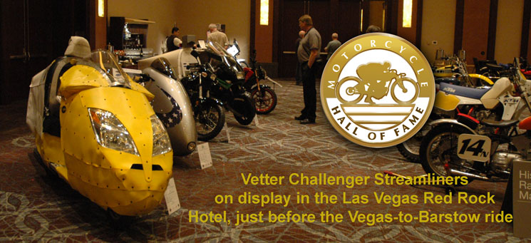 | Earlier this year, I wondered if Interstate 15 between Las Vegas and Barstow would make a good Final Vetter Challenge course. It is long... 173 miles. It is fast... 70 mph all the way. It is up and down hills... beginning at 1,200 feet above sea level and going over two 4,000 feet passes on the way to Barstow. It can have awful winds. Best of all... it is real. Five of the new Challengers met at the AMA Hall of Fame Inductions in Las Vegas to check out the possibilities. First, we displayed our machines Saturday at the David Mungenast Memorial Concours. | ||||||||||||||||||||||||||||||||||||||||||||||||||||||||