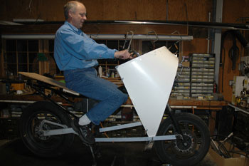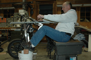 | A variety of riding positions Alan is mocking up the new handlebars. They must be about 6" higher and farther back. Alan wants to be able to sit comfortably and also be able to move about to stay comfortable. After all, this is to be a serious cross-country machine. The main mount for the nose is a very strong crossbar. It will be used for the forward controls as well as providing a feet-forward sitting style. | |||||||||||||||||||||||||||||||||||||