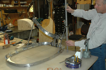 | Alan drills for flush mount Pop Rivits and assembles the nose. Each little angle bracket has a different angle. Taking the time to make sure each was at the perfect angle made assembly easy. Alan and I are learning these little tricks so we can pass them on to you when you make your streamliner kit. Before we put the aluminum skin on, we propped the nose structure on the bike to see what we have: | |||||||||||||||||||||||||||||||||||||