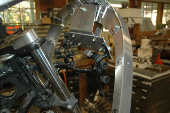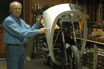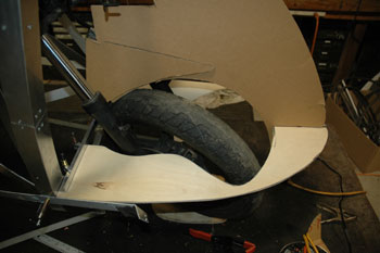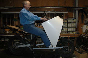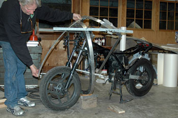 | I check to see how the nose curve will fit over the bigger Ninja front wheel. It looks fine. Alan pretends he is cruising with his feet on the pegs, holding his hands in a comfortable position. We will have to make new handlebars for this new riding position. Alan thinks it feels fine, too. | |||||||||||||||||||||||||||||||||||||