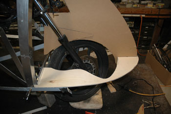 | The nose is being designed to be arttatched with three fasteners, just like the tail. Alan has made his bracket attach to the existing Ninja fairing mount. A quick wrap in temporary milk carton paper begins to give us an idea of the size of the streamlining. | |||||||||||||||||||||||||||||||||||||