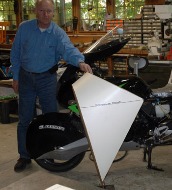 | Alan Smith is the perfect person to help streamline. He rides his Ninja 250 everywhere. He keeps records, too which means he knows the effects of any changes. I knew he was serious about fuel economy when showed up at the Quail Event this summer with his own streamlining. He 4th place and beat me on my sreamlined Helix. Then he rode that same 250 to Virginia and back on the way, stopping at the AMA Vintage Days Challenge, taking 4th place (and beating me again) before riding it back to California. | ![]() | ||||||||||||||||||||||||||||||||||||