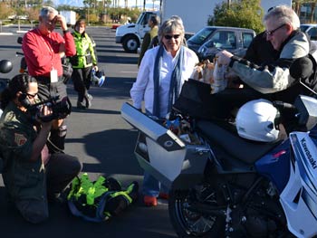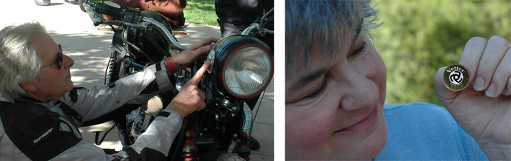 | Treven mounted a hoop with holes for bungee cords on his Diesel Challenger. He had never carried the grocies before. Four bags went in to Carol's satisfaction | Croft Long had enormous aluminum bags on his Kawasaki 650 Mother Ship. Obviously, Carol was pleased with how her groceries were handled. | |||||||||||||||||||||||||||||||||||||||||||||||||||||||||||||||||||||||||||||||||||||||||||||||