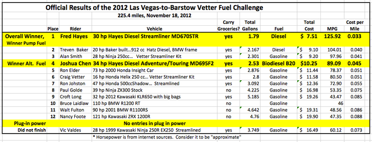 | My Helix holds a bit over 2 gallons of fuel. To go the 225 miles, I had to stop in the desert to add a gallon of very expensive gas. You know what old timers say: "Don't pass any gas in the desert" The expensive gas is why the car beat me. We measure the winner by the dollar amount of fuel. But how is it that a Honda car beat me - along with 9 other motorcycles? | ||||||||||||||||||||||||||||||||||||||||||||||||||||||||||||||||||||||||||||||||||||||||||||||||