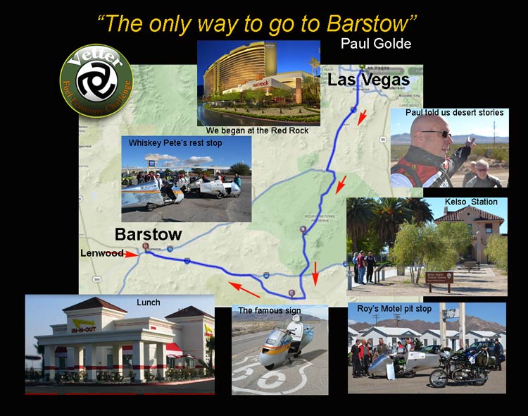| The Route Sunday, Nov. 18, 2012: We left Las Vegas at 8:30 AM and arrived at Barstow at 3 PM 224.5 official miles. It took a little longer than we expected. We were having fun. | ||||||||||||||||||||||||||||||||||||||||||||||||||||||||||||||||||||||||||||||||||||||||||||||||