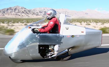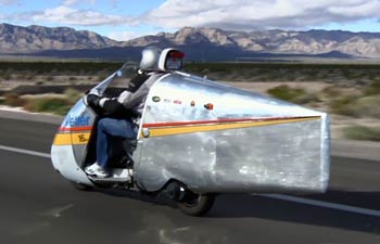 | Fred says: "I had to make some last minute changes on both bikes. I actually used the turbocharged engine (less the turbo) from my Bonneville bike in the streamliner. I just changed the injection pump and cam timing. I used much taller gearing in the streamliner and it worked well at high speeds, but I couldn’t use 5th gear at less than 60 mph. That may have hurt my mileage a bit on the run from I15 to I40. With the taller gearing, I had plenty of reserve power at any speed. I was able to move in and out of traffic at speeds approaching 80 mph on the run up I 40 from Ludlow to Barstow, even with the high head winds and lots of truck and auto traffic. | ![]() | |||||||||||||||||||||||||||||||||||||||||||||||||||||||||||||||||||||||||||||||||||||||||||||||