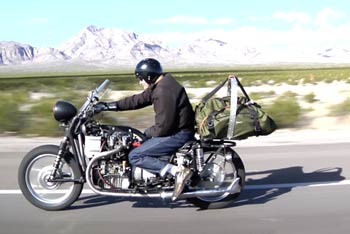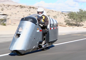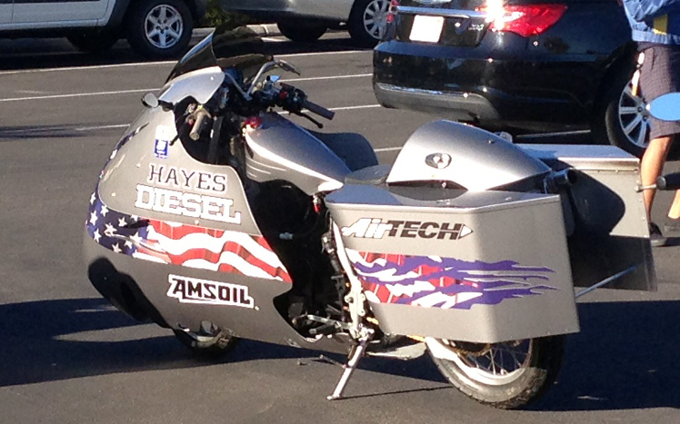 | I ran straight pump diesel from the Chevron Station across from the Red Rock in the Streamliner. I use AMSOIL Series 3000 5w-30 Diesel Rated engine oil in both bikes. The lighter, synthetic oil helps with fuel mileage and the diesel rated oil is compatible with our wet clutches. What might be of interest to some is that I used a Lithium-Ion battery in the Streamliner. It provided good power to start the diesel and it weighed 11 pounds less than our standard battery. It is quite expensive relative to the standard battery, but much less expensive than trying to reduce the weight of the bike by 11 pounds." Fred should have mentioned that he went 112 mph at Bonneville on this machine. | ||||||||||||||||||||||||||||||||||||||||||||||||||||||||||||||||||||||||||||||||||||||||||||||||