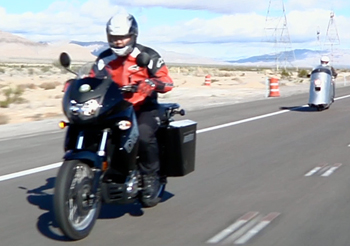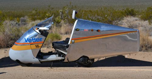 | Ron continues: I must confess that I did not notice the headwinds on the Vegas to Barstow Vetter Challenge, on the VT500. The fairing protects the rider very well. I did notice a tail wind on the 270 km [168 mile] trip back to Vegas, on I-15 though, from flags etc. beside the road, and will send you the fuel consumption numbers when the roads are not covered in snow and I can unload the bike and take it to the gas station. | ||||||||||||||||||||||||||||||||||||||||||||||||||||||||||||||||||||||||||||||||||||||||||||||||