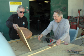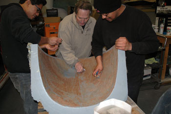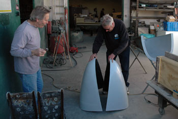 | Explaining the clay pattern for the hand streamlined pieces to Dave Smith who sees some kind of 1930s art deco thing. | Dave and company prep the nose mold for the first Vetter streamliner nose parts. Scraping the clay out took time. | |||||||||||||||||||||||||||||||||||||