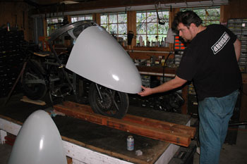 | Feb 3, 2012: With the nose mold polished and waxed ( background-right ), the first streamliner nose parts are ready! | Morgan Vetter holds the first streamliner nose part up onto Alan's Ninja 250! | |||||||||||||||||||||||||||||||||||||