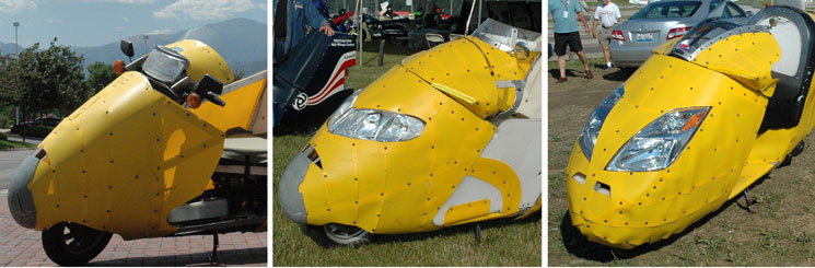 | The pictures above represent three years of design, engineering and riding. The shape of the nose is determined by so many more factors than just the wind. Which headlight will fit into the streamlining? On the left is the original Helix light which is not very streamlined. In the center, the nose is fitted with Dodge Caravan lights which didn't fit the shape and never pointed correctly down the road. Finally, Prius units which come with running lights and turnsignals, all streamlined. Now the windshield: How do we make a windshield that is streamlined still providing rider comfort? It is time to resolve these issues and finish this machine. The goal, of course is to get the the best mileage at 70 mph, into a 30 mph headwind, sitting upright and comfortable, carrying a useful load, like four bags of groceries and be our first choice machine in the garage. Designing an adjustable windshield | ||||||||||||||||||||||||||||||||||||||