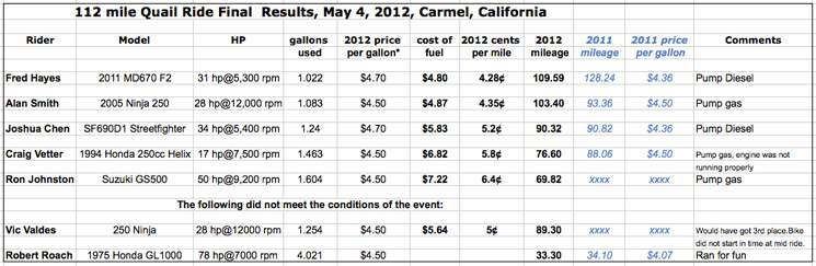 | Vic Valdes was headed to a 3rd place victory until his 250 Ninja failed to fire at the rest stop. It finally started but I had to pass him by so the bikes behind us could leave. 89.3 mpg 5¢ per mile $5.64 fuel cost Vic... comments below Ron: | ||||||||||||||||||||||||||||||||||||||||||||
