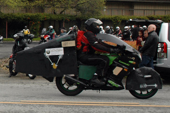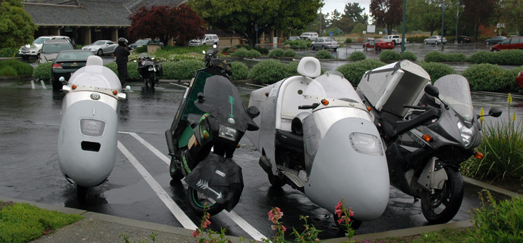 | The difference between first and second place was 7¢ Look at these two bikes. They are the same Ninja! No engine changes. No gearing changes. Stronger winds. The only difference is the real streamlining. Alan comments: "I agree that this year's Quail competition was very close. I think my gas mileage would have been better if I slowed down a little but I kept up with the pace bike at speeds up to 85 MPH. Personally I think the pace on Carmel Valley Road was a little to fast. | ||||||||||||||||||||||||||||||||||||||||||||