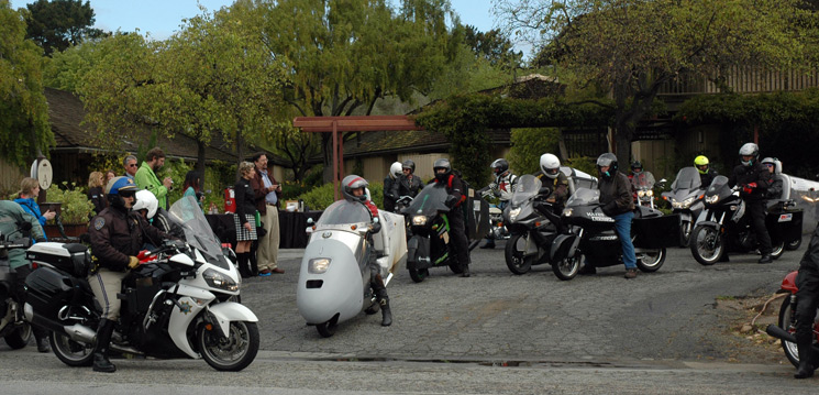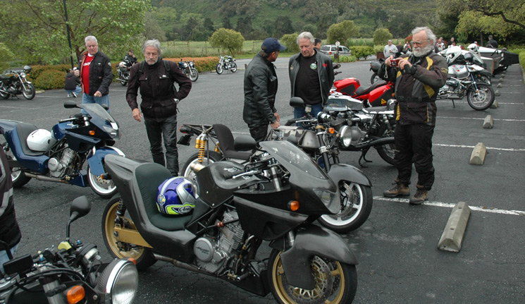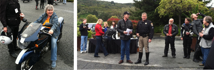 | Carol liked Perry's Alligator. Meanwhile, the rain let up and Gordon McCall and Sgt. Ray Faulk, our CHP ride leader explained the rules of the ride. Rob Talbott, red shirt on the right, owner of Talbott Wineries, hosted our pit stop along the way. Rob rode with us, the "Fast" group, as opposed to the "Slow" group, which was made up of vintage bikes. The "Slow" group had left a half hour earlier. | ||||||||||||||||||||||||||||||||||||||||||||