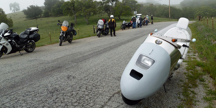 | Where was everybody? It turns out that the Vetter Challengers were way out front, right behind Sgt. Faulk and his big Concours 14. The rest of the bikes were several minutes behind us at our first break at the top of the pass. So much for streamlining and low horsepower, huh? It was all downhill after that. When we got to the bottom, we turned north into the 35-40 mph headwind. Even with the powerful headwind, I hit 77 mph a couple of times on my streamlined Helix. The Vetter Challenge bikes led the pack all the way back to the track. | ||||||||||||||||||||||||||||||||||||||||||||