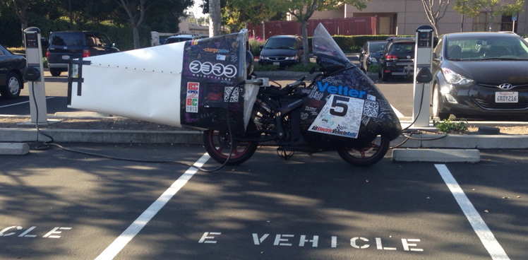 | Weight: TerryI added 3 additional battery packs weighing 60 pounds each or 180 pounds together. That was in addition to the 180 pounds of batteries already on the bike. This doubled his capacity from 9 kilowatt hours, to 18 kilowatt hours, raising the battery weight from 180 pounds on the stock motorcycle to 360 pounds of battery weight on the cross country prepped version. When he ran out of juice, he stopped and recharged. Terry discovered that more chargers help. The more chargers he carried on board, the faster his batteries could be recharged. Terry began adding chargers, tucking him in where he could. On his cross country ride, Terry carried 11 chargers. The chargers alone weighed 200lbs. When his bike tipped over, he could not pick it up by himself. This extra weight needs to be dealt with. Charging: With all those chargers, Terry could accept power faster than the new commercial J1772 Charge Stations, using both "nozzles" at a time, could provide. (picture above) He needed more electricity, faster! Terry found that could charge much faster at standard at RV park 50 amp hook ups. But he had no way of knowing how much power he was taking and no easy way of knowing how much to pay for that power. Some RV Park owners charged him a minimum "Tenter's hookup" fee. Some gave it to him for free. Some didn't know how to deal with him at all. Like gasoline, the cost of electricity varies from place to place. In addition, the local road tax must be added in to get a comparable cost. These problems need to be dealt with. Winds: We had expected winds to be an issue on the road. But winds turned out to be a problem at charging time. In windy areas - spelled Texas - Terry had to stay awake so he could hold his bike up against the winds. If it fell over, he could not pick it up. This problem needs to be dealt with. | ||||||||||||||||||||||