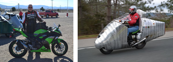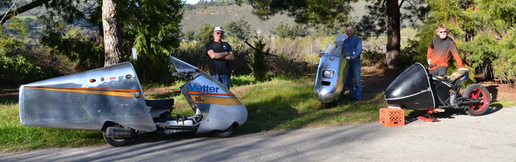 | Fuel is already precious in electric vehicles Electric vehicles cannot carry enough energy. On his first cross-country ride from Orlando to Santa Cruz, Terry Hershner had to find a charging station every 70 miles. He "rode and napped" his way across America. My Streamlined Helix will go 170 miles without stopping. Alan's streamlined Ninja 250 goes 600 miles. With such ranges, we have the luxury of normal sleep patterns. We are going to see if we can help Terry sleep better. | ||||||||||||||||||||||||||||||||||||||||||