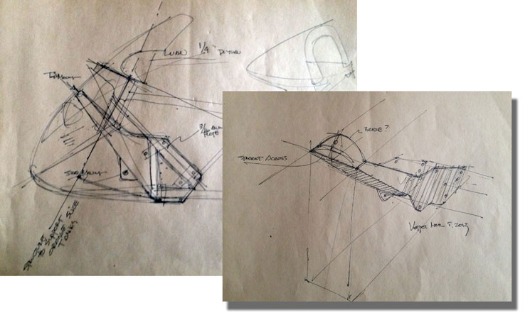 | We need a very strong support structure to hold a streamlined nose on a motorcycle. The box structure at the front of the Zero frame offers a perfect structure for making a strong nose mount. I made a few sketches, discussed them with Terry and Alan. We made a mock-up bracket out of 1/4" plywood to see how it would go. | ||||||||||||||||||||||||||||||||||||||||||
