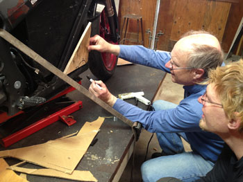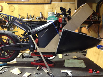 | Alan Smith spent last winter streamlining his 250 Ninja, so he knows how to do it.. Above, Alan shows Terry how we use wood, cardboard and hot melt glue to rough in the structure that will support the nose. We call it Cardboard Aided Design or CAD for short. Of paramount importance: We don't want the nose fall off. We want to create a structure so strong that you could hang the bike from it. Now is the time to be engineering for strength and safety. Meanwhile, Terry has been busy: | ||||||||||||||||||||||||||||||||||||||||||