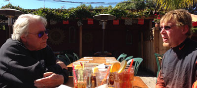 | Terry usually rides hunched over, which is normal when you ride into the wind without a fairing. The wind holds you up. With streamlining, so we sit more upright because there is no wind. We bore a bigger hole thru the air but we are much slipperier. Terry is not so sure he wants to ride this way. Alan and I assure him he will like it more. Designing mounting brackets to hold Vetter streamlining on a Zero | ||||||||||||||||||||||||||||||||||||||||||