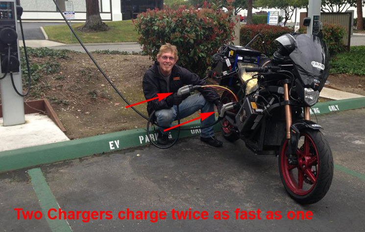 | On his trip from Florida, Terry noticed that public charging stations have two charging plugs. He never saw anybody using any charging station. Two plugs would fill his batteries twice as fast as one. So, Terry added another on-board charger and another JI772 plug. Now he fills his bike in half the time. This represents a 50% reduction in time spent recharging. Will Vetter streamlining represent a 100% increase in range as it does with the Ninjas? These are major numbers we are dealing with! | ||||||||||||||||||||||||||||||||||||||||||