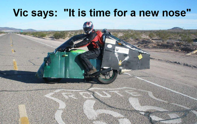 ![]() | You gotta hand it to Vic. He put his first 250 Ninja Streamliner togerther on a shoestring and old Coroplast political signs. Vic rode from California to Mid Ohio and back like this. He even rode the Las Vegas to Barstow Challenge. He scared many of us that could see his bodywork fluttering in the wind. It was time for a real nose. Vic bought the same nose parts as on my Helix and Alan's Nnja. His friends were relieved. | |||||||||||||||||||||||||||||||||||||||