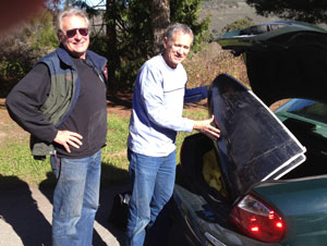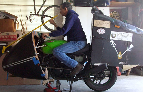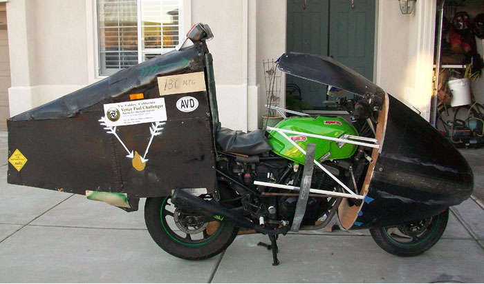 | As of Mar 10, 2013: "! finished getting the new Vetter fiberglass nose mounted on my bike. I still need to do some more finish work such as sealing the plywoood bulhead and adding ducting but I wanted to see how the new nose felt and performed. I started using it to run errands to ensure it was strongly attached and that the turning clearance was OK. Engine temps are good although the weather has been cool. The bike is quieter through the air and I'm hold top gear longer and at smaller throttle openings than before. Alan got back from Phoenix with his "new" (2004 model) stock Ninja 250 and wanted to do a baseline test on our 100 mile test loop. So we decided to ride this morning. Alan's friend Ken joined us with his new Honda CRF250L. We enjoyed the ride through the backroads between Livermore and Patterson and has excellente Mexican food for lunch. We rode back to our starting point gas station and refilled our bikes: Alan: 77 mpg, Ken 83 mpg, Vic 100 mpg. The weather was cool with some wind. A good start for this current version. | ||||||||||||||||||||||||||||||||||||||||