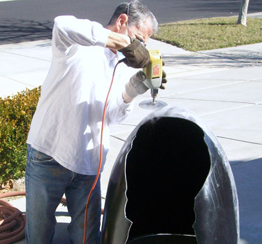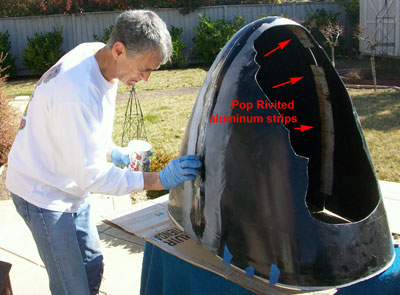 | Here Vic fiberglasses the two halves together. Note: Vic has first Pop Rivited strips of aluminum into the inside to force the two fi glass pieces together, makng them fit as good as possible. Use aluminum Pop Rivits. Then he sanded the outside down to "feather" the edges. This allows him to end up with a substantial thickness of a fiberglass band for strength. | ||||||||||||||||||||||||||||||||||||||||