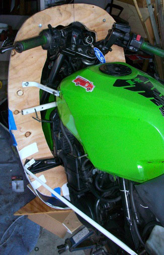 | The bottom rear line of the nose should be parallel with the ground The top line should be aimed to just above your eyes Rotate it to suit. You may have to separate the two halves and add a gap at one end. Make some temporary brackets to hold the bulkhead. Put temporary wood screws into the bulkhead to hold bottom nose piece in place Sit on your bike... move the nose around until it seems right. Twist the throttle and say: Rummm Rummmm rummm. Get off and stare at it. When you are happy, mark the opening for the front wheel | ||||||||||||||||||||||||||||||||||||||||