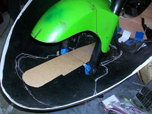 Make a template of the front wheel profile. Hot melt the axle on it.Put it into the axle holesTurn the forks full lock. Draw a line around.This will be your wheel opening. | ![]() | |||||||||||||||||||||||||||||||||||||||